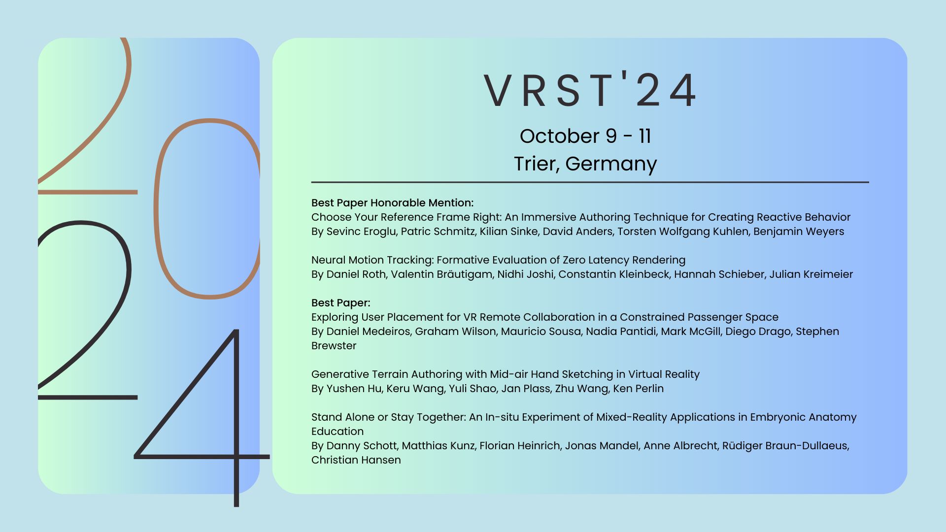 - [01/2025] Two papers accepted at IEEE VR (first author and co-author)